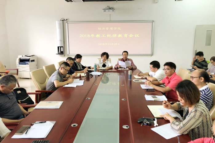 本网讯 为深入学习贯彻习近平新时代中国特色社会主义思想和党的十九大精神,加强党章党规党纪教育和警示教育,10月25日,经济管理学院在学院会议室举行2018年度纪律教育学习月教工教育学习会议,学院全体教职工参加了会议。会议由学院党总支书记曹仓主持。