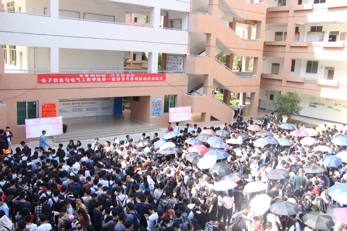 本网讯 11月13日中午,电子信息与电气工程学院以“书香满校园 共享读书乐”为主题的第一届读书月活动启动仪式在电子楼广场举行。1500余名师生参加了启动仪式。