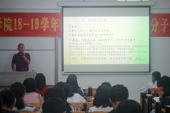11月11日晚上,学院于旭日大楼多媒体教室219开展以“党员发展教育与管理”为题的培训讲座。学院党总支副书记郭爱平围绕“大学生为什么要入党”主题进行专题辅导,学院团校培训班全体学员参加讲座。讲座中,郭爱平对党的性质和宗旨、路线和纲领、指导思想和奋斗目标、党员义务和权利以及党的纪律等方面进行了解读。郭爱平介绍了入党要求程序及其注意事项,指出发展党员要坚持个别吸收原则,坚持党章规定的党员标准,始终把政治标准放在首位,严格遵循入党程序,认真执行“三投票五公示一答辩”制度。他强调,要加强品德修养,培养奋斗精神,心无旁骛求知问学,增长见识,丰富学识,全面提升综合素养,树立正确的入党动机,切实增强“四个意识”,坚定“四个自信”,积极向党组织靠拢。