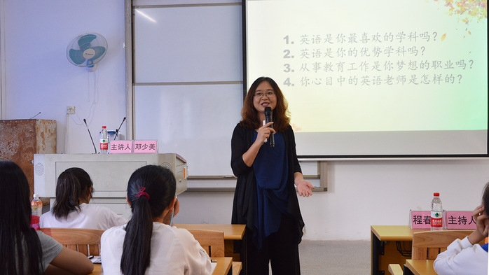 本网讯 11月5日下午,中学名师进校园讲座第90场暨外国语学院“卓越英语教师培养”系列讲座之十三——如何练就“3E”英语人,在旭日大楼519教室举行。讲座由教务处主办,外国语学院承办,惠州中学英语高级教师、广东省特级教师、惠州市英语学科教学带头人邓少美老师主讲,外国语学院2015级至2018级英语专业学生聆听了讲座。