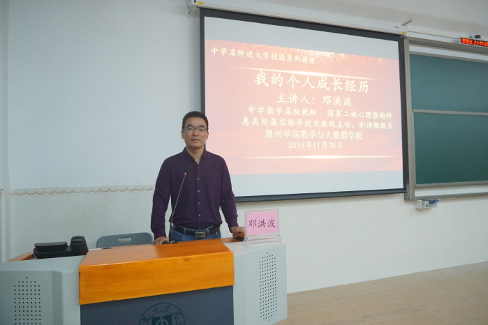 本网讯 11月30日惠高附属实验学校政教处主任邓洪波应邀在教学实验大楼206室作《个人成长经历》讲座,2018级数学与大数据学院数学专业全体同学,信息管理与信息系统、应用统计学专业等部分同学聆听讲座。讲座由教务处主办,数学与大数据学院承办,为中学名师进校园第102场暨数学与大数据学院《大学生职业规划课》嵌入式课程之一。