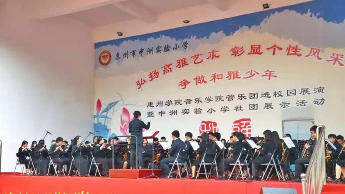 本网讯 11月30日上午,音乐学院管乐团赴中洲实验小学开展高雅艺术进校园活动。活动现场管乐团邀请了中洲实验小学管乐团打击乐队员代表一同演出,为全校师生演奏了《蓝色山脉》《加勒比海盗》《LET IT GO》《茉莉花》《玫瑰狂欢节》五首名曲。管乐团指导老师石奕夫在表演期间还为同学们介绍了管乐团的各种乐器。活动在合唱《歌唱祖国》中落下帷幕。学院党总支书记李富明,交响乐团团长助理、小提琴专任教师李帆,惠城区教研室副主任马燕出席活动。供稿:音乐学院审稿:李富明 杨智圆 审核:林少章 签发:金伟
