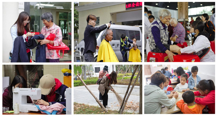 同学们分为宣传队、支教队、慰问队、车缝队、卫生队等,在村委会志愿者的陪同及协助下,按照计划在各自岗位上积极开展工作。宣传队在霞角村内进行流动宣传,宣传村委会有关服务活动;支教队分为折纸绘画、歌舞、知识竞答三个组,教霞角村小学生唱歌、折纸、画画等;慰问队在村委同志的带领下,走访孤寡老人和留守儿童家庭,帮助孤寡老人干家务,为他们画肖像,同时也赠送他们一些实用的礼物;车缝队的同学则是利用自己在课堂上学到的成衣工艺技术免费帮助村民缝补衣服、上拉链、改裤脚等;卫生队则帮助村民打扫村委活动中心,清扫祠堂围屋周边的杂草等。