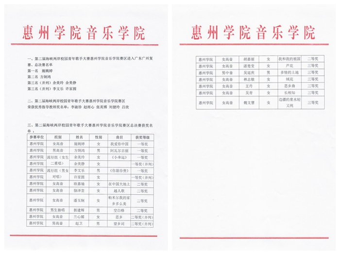 本网讯 12月21日下午,第二届海峡两岸校园青年歌手大赛惠州学院音乐学院赛区总决赛在音乐楼排演厅举办。17支队伍参与本次决赛竞演,排名前3的同学将代表惠州学院参加广州赛区的复赛。音乐学院副院长李淑珍、广东广播电视台南广全媒体创新中心主任曹卫东担任比赛评委。
