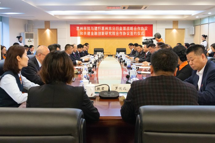 本网讯 2019年3月30日,惠州学院与建设银行惠州市分行全面战略合作协议和共建金融创新研究院合作协议签约仪式在我校行政楼202会议室举行。我校党委书记、校长彭永宏,党委副书记、纪委书记罗川山,副校长许玩宏、刘国栋及学院有关部处、二级学院负责人,建行惠州市分行行长范题,副行长李国荣、张健雅及各部门主要负责人等出席签约仪式。罗川山主持仪式。