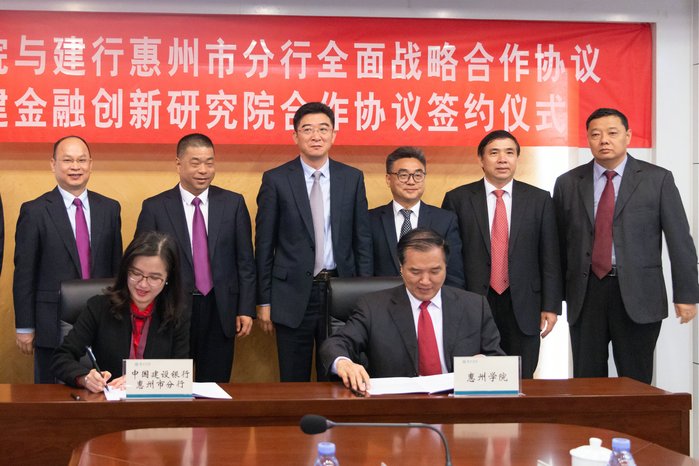 张健雅简要介绍了双方全面战略合作协议和共建金融创新研究院合作协议的相关内容。在双方有关负责人的见证下,许玩宏与张健雅分别代表我校和建行惠州市分行签订了全面战略合作协议和共建金融创新研究院合作协议。