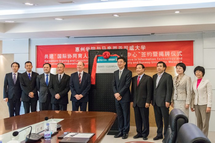 本网讯 4月3日上午,惠州学院与马来西亚双威大学共建“国际协同育人与信息技术研究中心”签约暨揭牌仪式在行政楼202会议室举行。马来西亚双威大学校长Graeme Wilkinson 、副校长潘永忠、亚洲学术与科研伙伴关系大使庄国文、理工学院副院长刘显伦、校长夫人李波一行五人,我校党委书记、校长彭永宏,副校长许玩宏、刘国栋等出席仪式。许玩宏主持仪式。