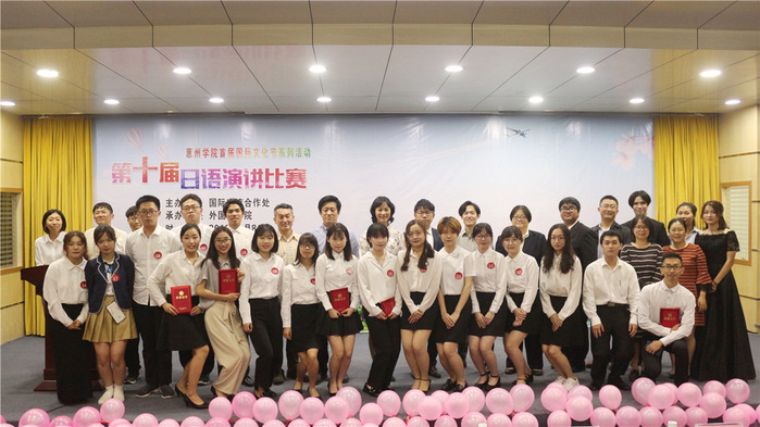 本网讯 4月8日晚,我校首届国际文化节系列活动之第十届日语演讲比赛在图书馆报告厅进行。本次比赛由国际交流合作处主办,外国语学院承办。恵州日本人商会会长代理山中久雄先生、惠州南油林业经济发展有限公司董事兼副总经理大野智之先生以及外国语学院5名日籍外教担任本次比赛评委。19名日语专业二、三年级的同学参加比赛,外国语学院党政领导、日语专业教师以及日语专业全体学生观看了比赛。