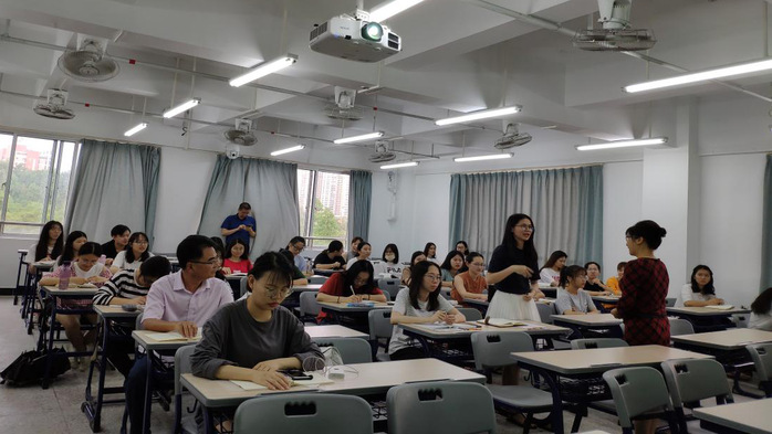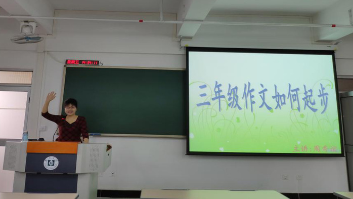本网讯 4月26日下午,惠州市惠阳区淡水第九小学周秀谊老师应邀在旭日大楼402课室作《三年级作文如何起步》主题讲座。本次讲座为学校中学名师进校园系列活动第115场,由教务处主办,文学与传媒学院承办。文学与传媒学院无课教师及2018级汉语言文学专业学生到场聆听讲座。讲座由文学与传媒学院卜凌云老师主持。