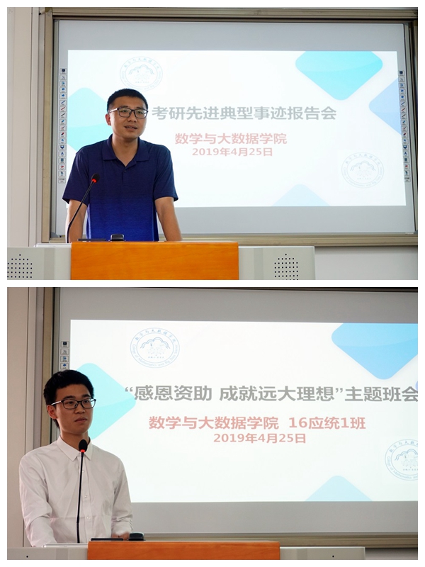 本网讯 4月25日下午,数学与大数据学院于旭日大楼302多媒体教室举行考研先进典型事迹报告会。辅导员,考研学生代表黄嘉琪、陈宝珠、陈龙洲以及16级应用统计学1班全体学生参加了会议。