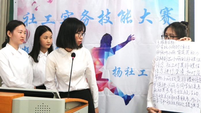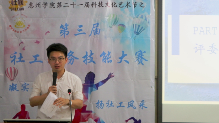 本网讯 4月26日晚,由惠州学院学生社团联合会主办的第三届社会工作实务技能大赛决赛在旭日大楼602课室举行。政法学院副院长、社会工作系主任及教师代表出席活动。本次比赛邀请了惠州市慈航公益协会林国森先生等人担任专业评委。