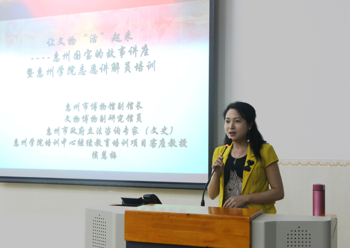 本网讯 为深入了解惠州文物的历史文化,感受传统文化的深厚底蕴,由共青团惠州学院委员会主办、政法学院青年志愿者分会承办,让文物“活”起来——惠州国宝故事讲座暨文化志愿讲解员培训于4月27日在教学实验大楼107课室举行。活动特邀惠州市博物馆副馆长侯慧梅主讲。学校团委副书记、政法学院党总支副书记及教师、辅导员代表,博物馆工作人员和文化志愿者们聆听了讲座。