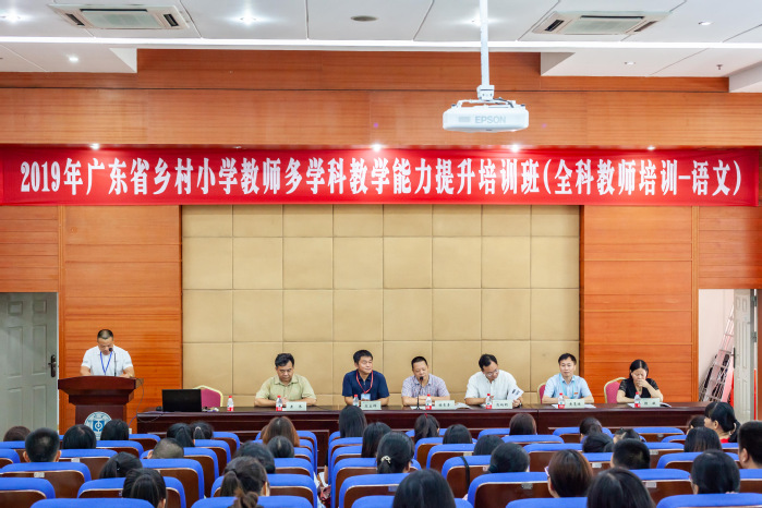 本网讯 7月8日上午,2019年广东省乡村小学教师多学科教学能力提升(全科教师培训——语文)培训班开班典礼在我校文城视频会议厅举行。我校文学与传媒学院党政负责人、继续教育学院相关负责人及51名培训班学员参加了开班典礼。