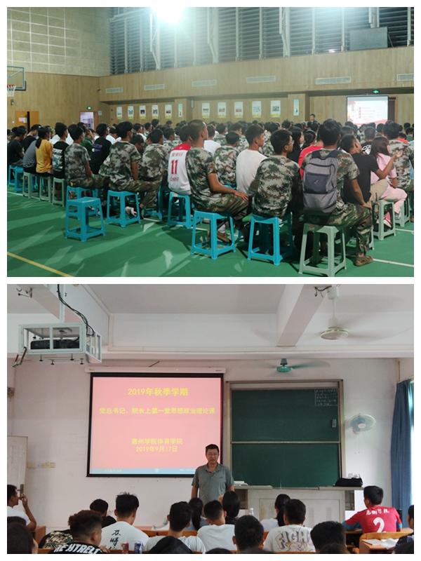 本网讯 体育学院党总支书记和院长分别于9月17日、9月26日为2017级和2019级体育教育专业学生共计289人讲授秋季学期第一堂思想政治理论课。