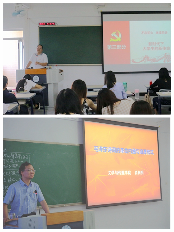 本网讯 为进一步加强学院学生的思想政治教育工作,让学生增强政治意识以及责任意识,主动承担新时代新使命,做新时代的追梦人,文学与传媒学院积极开展思想政治理论课教学。院长肖向明和党总支书记赖常青先后于9月9日和9月27日下午在旭日大楼多媒体课室为学生上本学期“思政第一课”。