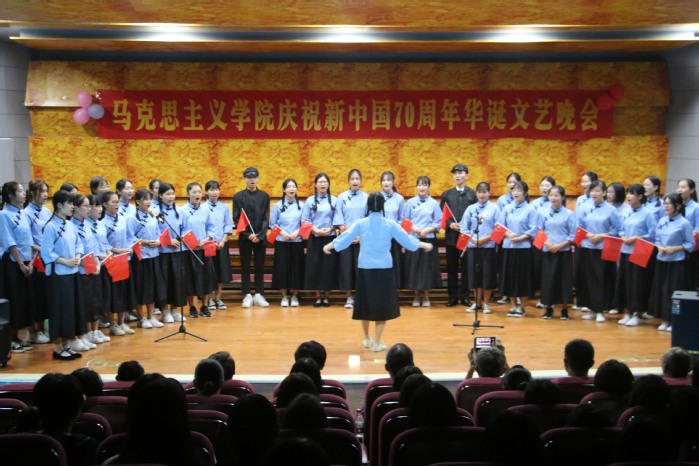 本网讯 为庆祝祖国七十华诞,升华学子爱国情怀,9月29日晚,马克思主义学院在音乐学院小剧场举办以“迎国庆70周年,争做时代新人”为主题的文艺晚会,学院领导、部分教师以及思政专业全体学生参加活动。