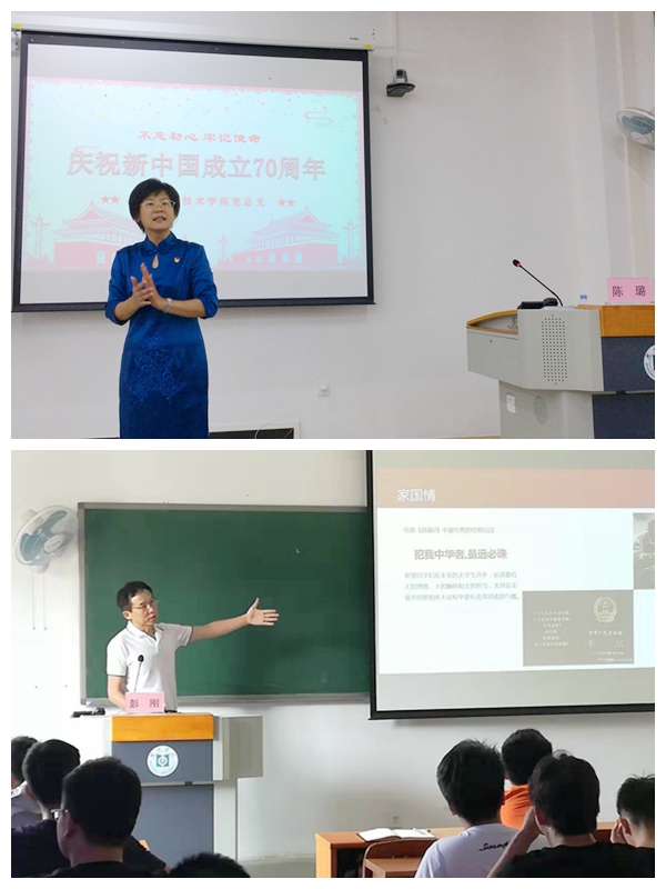 学院院长彭刚以“志存高远、情系家国”为题,与同学们一起回顾了新中国成立70年的峥嵘历史,以自己个人的成长历史为例,谈爱国,讲立志,从个人梦到中国梦的视角,具体分析了新时代大学生实现个人梦与国家梦的内在关联。他结合学科专业特点,以华为公司的科技创新为切入点,勉励全体同学要自信自强、独立思考、勇于创新、情趣高雅、拼搏进取,在学习生活中守初心、担使命、爱祖国、跟党走,用行动践行爱国主义。