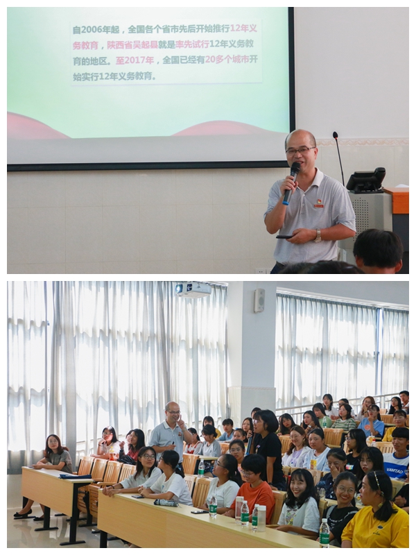 课上,谢伟强以自己的亲身体会告诫新生们一定要牢记习近平总书记对青年学生提出的“勤学、修德、明辨、笃实”这四个要求,扣好人生的第一粒扣子。谢伟强对“幸福”和“中国梦”的含义进行了详细诠释,人民幸福是国家幸福的基础,国家幸福是人民幸福的有力保障。“辉煌七十载,奋进新时代”“奋斗永远都是这个时代的最强音”“厉害了我的国”“中国的新四大发明”“港珠澳大桥”等无不展示着中国的强大,在实现中华民族伟大复兴中国梦的道路上,中华儿女正砥砺前行。课程的最后,谢伟强向同学们介绍了时代楷模——黄文秀,研究生毕业的黄文秀,放弃了留在大城市工作的机会,毅然回到家乡,在脱贫攻坚第一线倾情投入、奉献自我,用美好青春诠释了共产党人的初心使命,谱写了新时代的青春之歌。他以黄文秀的事迹勉励同学们,不忘初心、牢记使命,勇于担当、甘于奉献,激励同学们在新时代的长征路上做出新的更大贡献。