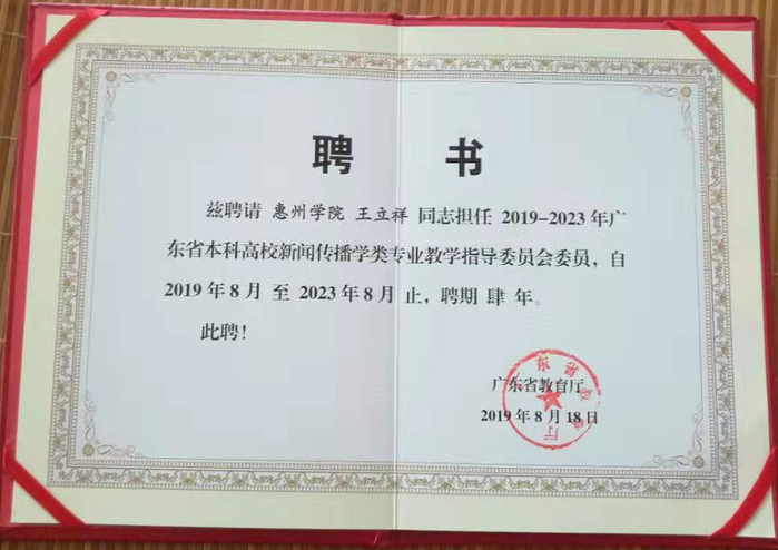 本网讯 近日,广东省本科高校新闻传播学类专业教学指导委员会换届大会举行。我校文学与传媒学院副院长王立祥教授再次获聘为该教指委委员。