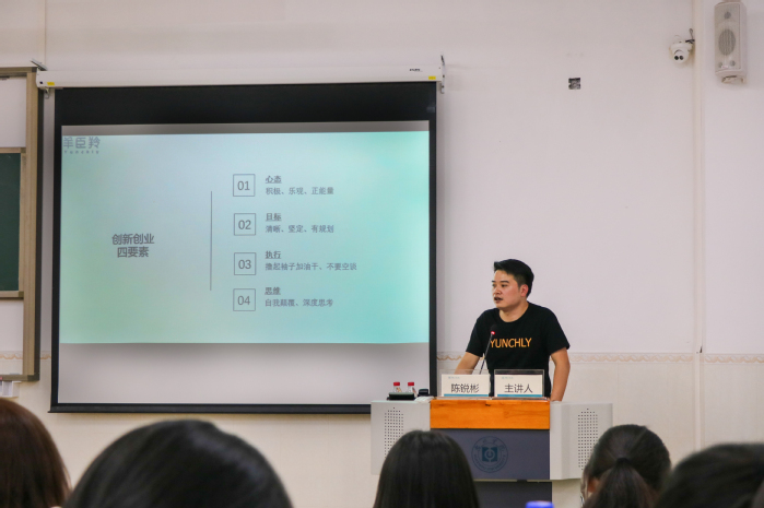 陈锐彬校友告诉同学们要做一个有目标的大学生。他在校期间曾担任企业与市场调研协会会长,在协会锻炼了自己的交往能力,这为日后创业垫定了基础。2012-2014年,陈锐彬校友在华阳光电技术有限公司担任销售工程师,为了解产品,他投身到工厂的流水线,深入了解生产的每个环节,以更好地了解产品、销售产品。在成为销售经理后,陈锐彬校友毅然辞职,开始了自己的创业旅程,带着啃馒头的决心,跟团队凑齐了第一笔资金,在广州开启了电商事业,用尽一切资源,让客户、员工、股东满意。未来羊臣羚公司的发展、畅想以及目标是要让每个家庭用上好的母婴产品,让每个员工过上幸福的生活。他强调,在创业过程中存在各种各样的风险,同学们不要以赚快钱为目的去创业,要全身心地投入,脚踏实地从零到百去奋斗。