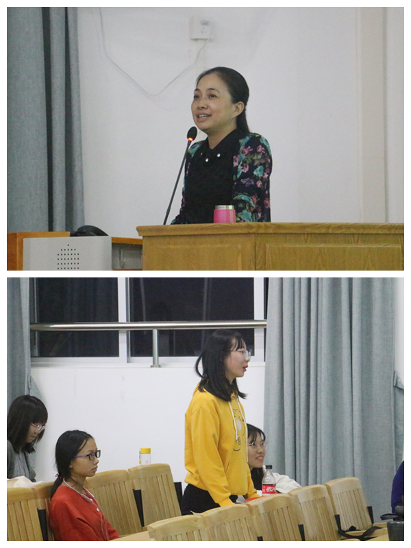 彭琼芳老师从事班主任工作研究多年,在班主任工作方面颇有积累,获得多项省级以上的相关教学研究项目,多项市级以上的荣誉。她首先从班级精神文化体系的构建、班级常规管理和班级特色管理三个方面层层递进,系统讲述了班主任工作的基本规律与运作模式。她围绕如何做一个优秀的班主任这一问题,总结了班主任工作的艺术。她认为,班主任工作的艺术具体体现在如何平衡各方关系、如何处理棘手问题,如何做到进退自如等环节,但核心要领在于以无限的爱心和热情投入到工作之中,让孩子们能够健康快乐成长。为了帮助同学们更好地理解班主任工作的运作细节,彭琼芳老师先后举出了6个个案,让在场学生参与讨论分析,提出适当的解决办法。同学们在彭琼芳老师生动幽默的引导讲解中,逐渐领悟到了班主任工作的重要性和复杂性,初步掌握了一些班主任工作的要领,现场反应极为热烈。