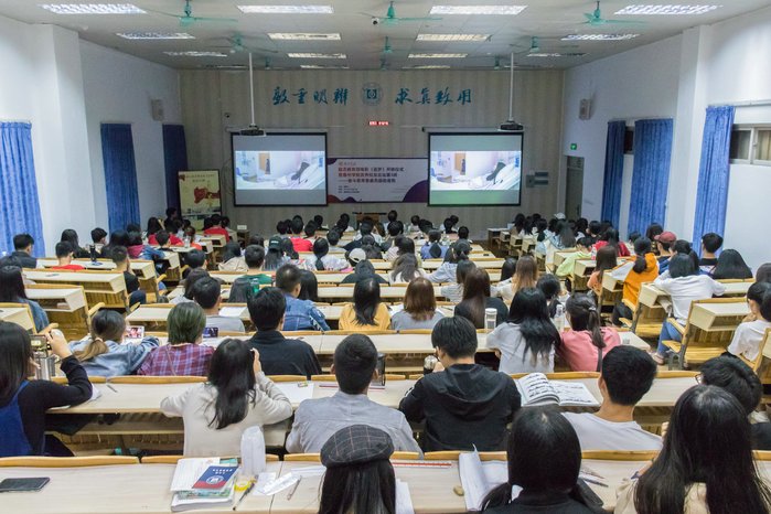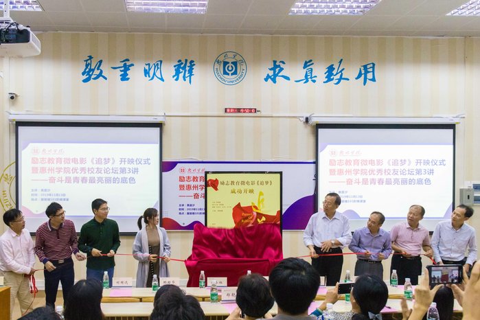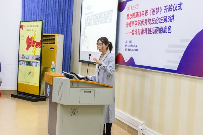 本网讯 11月13日晚,励志教育微电影《追梦》开映仪式暨惠州学院优秀校友论坛第三讲在服装楼101教室举行。活动以“奋斗是青春最亮丽的底色”为主题,旭日广东服装学院2018届毕业生黄晨汐应邀担任主讲嘉宾,校友办、团委、学生处、旭日广东服装学院相关负责人,学生代表等参加了此次活动。
