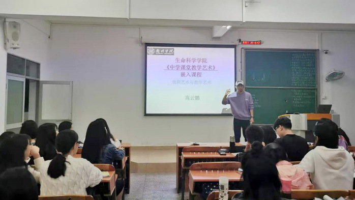 据悉,高云鹏老师是出色的演员和编剧,是广东省戏剧家协会会员和惠州市惠城区戏剧家协会副秘书长。从艺以来,高老师参演的电影、电视剧以及编导的作品在各种活动中屡获大奖,包括广东省五个一工程奖获得者、广东省第七届戏剧花会金奖,惠州市小剧小品大赛金奖等。本次活动是学院2017级生物科学专业《中学课堂教学艺术》本学期开展的第二次嵌入式教学,同学们对于这种教学形式反映良好。