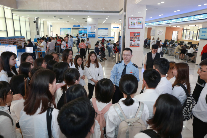 税务局股长孔海萍等工作人员陪同参观,并详细介绍了税务局各个工作单位负责的主要业务。同学们参观了自助终端设备、填单区等办公场所并积极提问,工作人员都耐心地给予解答。