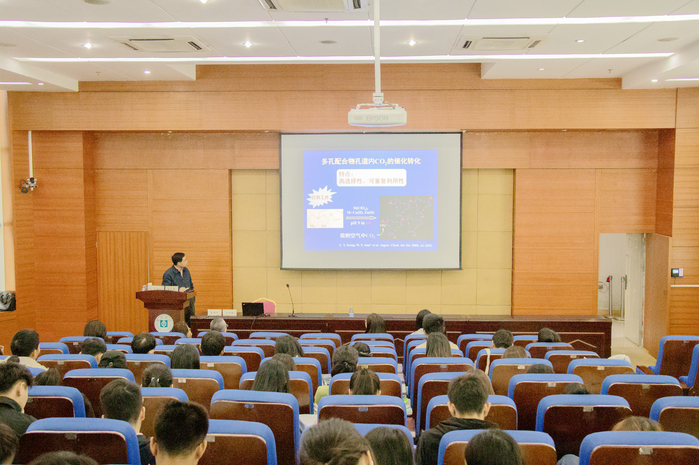孙为银教授介绍了多孔配合物的控制合成及其识别、转化和催化性能研究现状,重点讲述了控制合成、分子离子识别、催化转化三个方面的内容。他以二氧化碳为例,结合CO2的光合作用,向大家介绍了多孔配合物孔道内CO2催化转化、有效催化与CO2环氧化合物反应、光催化还原CO2、13C标记的光催化还原CO2等多种催化反应实验;结合PtNH2-UiO-68金属有机框架复合材料光催化还原CO2性能研究、基于锆类金属有机框架进行不同官能团修饰及相应光催化还原二氧化碳性质研究、光催化还原CO2的电子转移路径等丰富的研究实验数据,讲述了光催化还原CO2的高效形和高选择性。