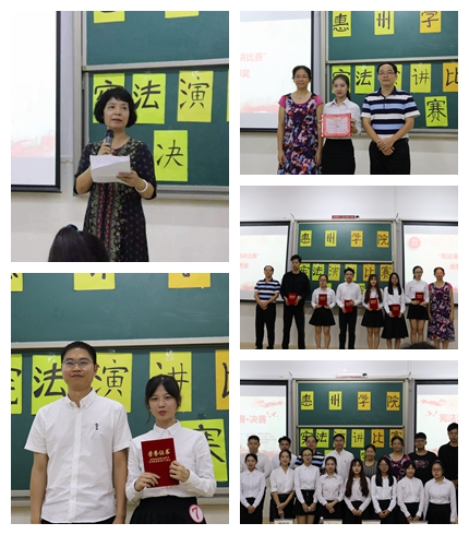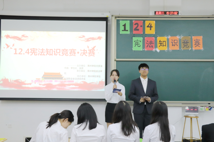 2019年12月4日晚,由惠州学院主办,政法学院承办,学生社团联合会法律促进会协办的“学宪法”系列活动之法治知识竞赛决赛在旭日教学大楼107课室举行。在40支初赛队伍中脱颖而出的“未来法律人队”“盛夏法队”“最棒队”以及“天天向上队”等四支队伍参加了决赛。最终,“天天向上队”获得一等奖,“最棒队”获得二等奖,“盛夏法队”获得三等奖,“未来法律人队”获得优秀奖。