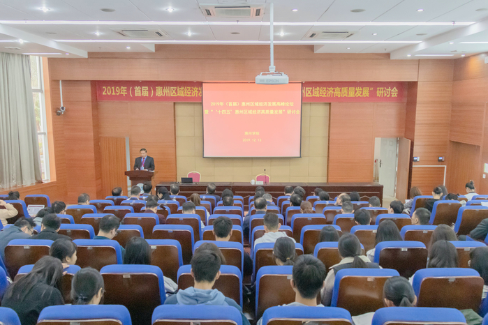本网讯 2019年12月13日,2019 年(首届)惠州区域经济发展高峰论坛暨“‘十四五’惠州区域经济高质量发展”研讨会在我校文城会议厅举行。会议由惠州学院主办、学校区域经济研究创新团队和应用经济学特色学科建设团队承办、惠州市发改局和市统计局指导,副校长许玩宏、校长助理梁建生教授、市发改局副局长黄俊堂、市统计局副局长周华、华南理工大学张振刚教授、广东省社科联决策研究中心主任郑红军研究员、暨南大学韩兆洲教授、广东财经大学林洪教授出席会议,各县区发改局、统计局的领导、嘉宾和我校师生代表参加会议。会议由我校科研处主要负责人主持。
