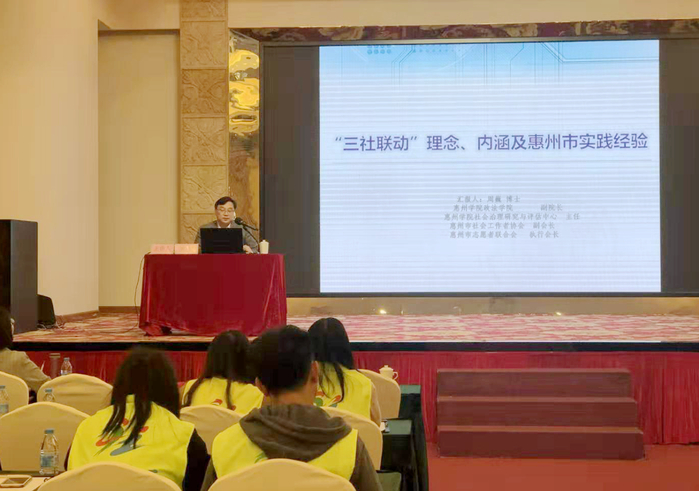培训会上,周巍博士结合惠州社会工作实际,就“三社联动”的理念、内涵与实践作了精彩的分享,并与参加本次培训的学员进行了互动交流,热情回答了他们的疑问。
