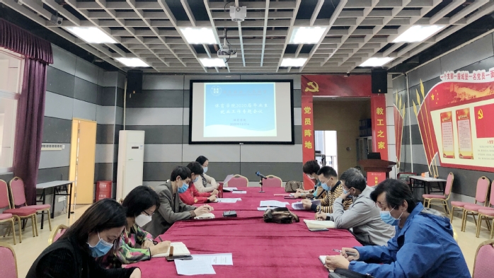 学院党总支副书记陶蓉传达了学校《关于进一步做好疫情防控期间毕业生就业创业工作的通知》精神,通报了学院2020届毕业生基本情况,包括已签约、考研、有签约意向、创业筹备和待就业学生人数,汇报了前期对就业意向、就业困难学生初步摸排的情况,并围绕进一步做好摸底排查、分类指导、一对一就业帮扶等方面,解读了学院毕业生就业工作方案。