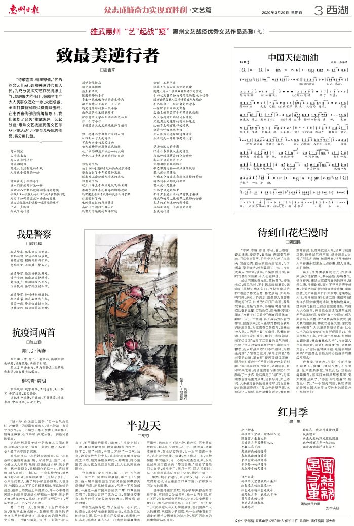 本网讯 3月29日,我校马克思主义学院雷吉来副教授,在《惠州日报》上发表了题为《致最美逆行者》诗歌。诗歌情真意切,读来非常感人。雷吉来副教授作品《致最美逆行者》关于这首诗的创作,雷吉来老师说:“突如其来的疫情,使这个春天显得很特别,奋战在抗疫一线的医护人员,夜以继日,舍生忘死,他们的事迹感天动地,当然也深深地感动着自己,因此就想到通过写一首诗,来表达一下自己难以言表的感动和感情!”供稿:马克思主义学院审稿:刘国远 杨智圆 审核及签发:金伟