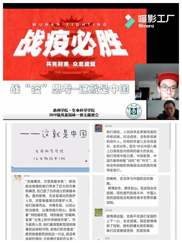 本网讯 为深入贯彻落实习近平总书记关于新冠肺炎疫情防控的重要指示精神,切实加强学生的思想教育和价值引领,根据党委学生工作部的安排,生命科学学院各班于3月16日-22日认真组织全体学生开展了主题为“战‘疫’思考——这就是中国”的线上班会。