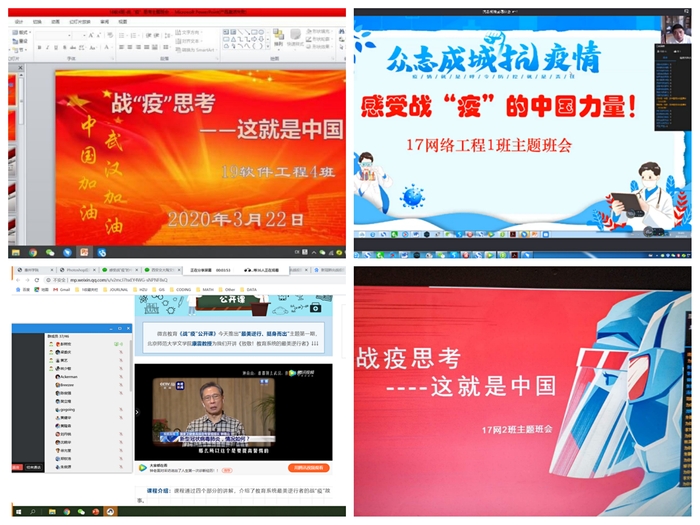疫情发生以来,学校党委高度重视,全方位指导学院开展抗疫工作。学院全体师生响应“不停学”的号召和安排,居家开展线上课程学习。这在历史上是第一次,师生们云见面、云互动。为了让全体学生充分了解党中央抗疫的决心和信心,指导学生们做好科学防疫工作、珍惜生命安全和身体健康,鼓励全体学生与全国人民共克时艰;同时帮助学生们克服网络学习条件不足的困难,把学校学院的温暖和关怀送达学生,让学生思想不落伍,线上学习不掉队,学院党总支、党支部、团总支、团支部联手组织了这样一期主题班会。各主题班会紧紧结合“战‘疫’思考——这就是中国”的主题进行,以鲜明的主题向抗疫英模致敬,充分表达青年大学生的爱国爱党情怀。