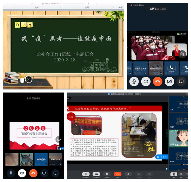本次线上班会主题为“战‘疫’思考——这就是中国”,形式多样、内容丰富。各班主任组织本班学生利用微信、腾讯会议、钉钉等线上平台进行。班会上,班主任带领同学们集中观看了战“疫”公开课,帮助同学们深度了解疫情知识,引导大家正确理性地面对疫情,坚定战胜疫情的信心。同时,组织同学们对疫情开展深入研讨,讨论身为当代大学生,疫情当前我们应如何发扬爱国主义精神、如何加强理想信念教育、如何肩负起时代的重任等话题。老师们通过谈心对话的方式了解同学们疫情期间的状态,提醒同学们注意防护,并合理的规划时间,实现自我教育和自我管理,在家加强锻炼,劳逸结合,拥有积极乐观的生活态度,心怀感恩。