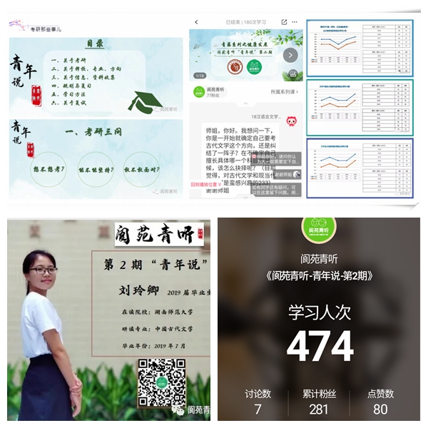 本网讯 3月15日,文学与传媒学院阆苑青听工作室学生团队在党总支书记赖常青、副书记施少翰的支持下,辅导员彭嫚丽老师的指导下,开展了考研经验分享直播,邀请学院2019届毕业生、考取湖南师范大学中国古代文学专业硕士研究生的刘玲卿同学进行主题分享,平台参与人次达474次。