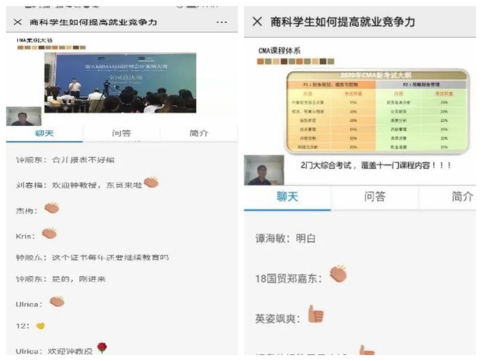 本网讯 3月14日晚,经济管理学院和中博教育联合举办了“商科学生如何提升就业竞争力”的CMA(美国注册管理会计师)直播讲座活动。讲座邀请了中博教育CMA项目总监、明星讲师徐鑫老师主讲,经济管理学院部分教师、学生近200人观看了直播。