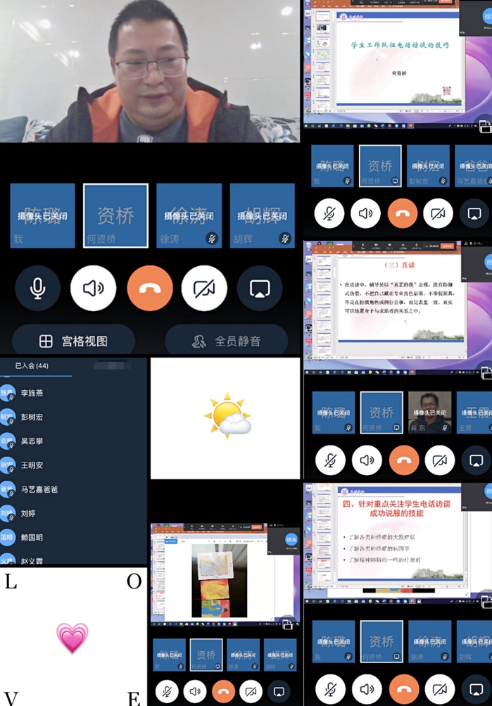 何资桥教授以“学生工作队伍电话访谈的技巧”为主题,结合案例,从电话访谈信任关系的建立、访谈中的参与性技巧、电话访谈中的影响性技术、针对重点关注学生电话访谈成功说服的技能等方面进行讲授。老师们听后,纷纷表示这些工作技巧特别实用,针对性强,为大家在疫情期间与学生进行有效沟通提供了很大的帮助。
