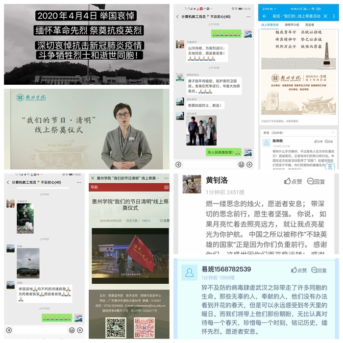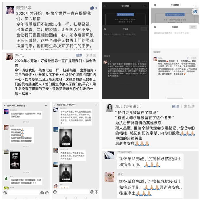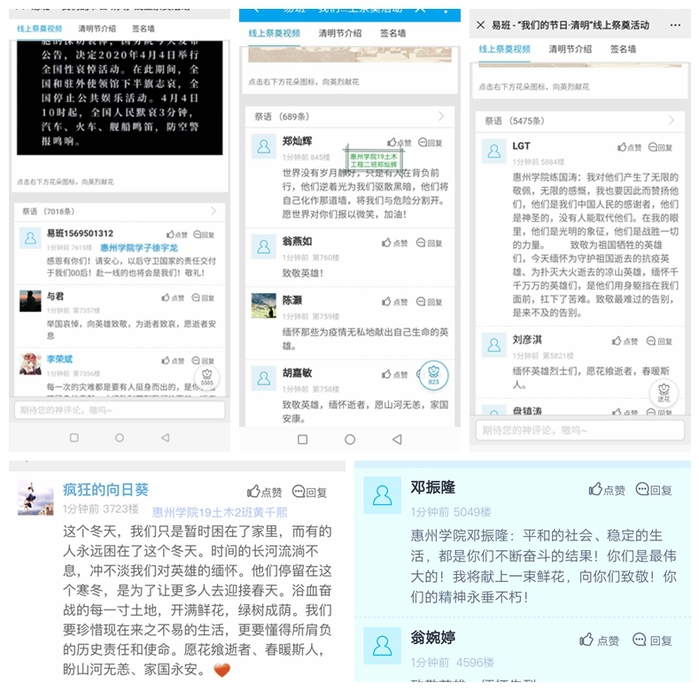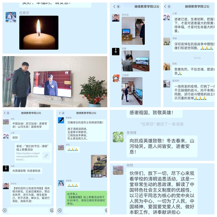 本网讯 为号召广大师生缅怀革命先烈,祭奠抗“疫”英烈,培育和践行社会主义核心价值观,传承中华传统文化,学校于4月4日开展了以“缅怀革命先烈、祭奠抗疫英烈”为主题的“我们的节日·清明”线上祭奠活动,活动由党委宣传部、党委学生工作部、党委教师工作部主办,政法学院承办。学校各学院、部门积极参与线上祭奠活动,师生们纷纷留言,表达对革命先烈、抗疫英烈的缅怀之情。