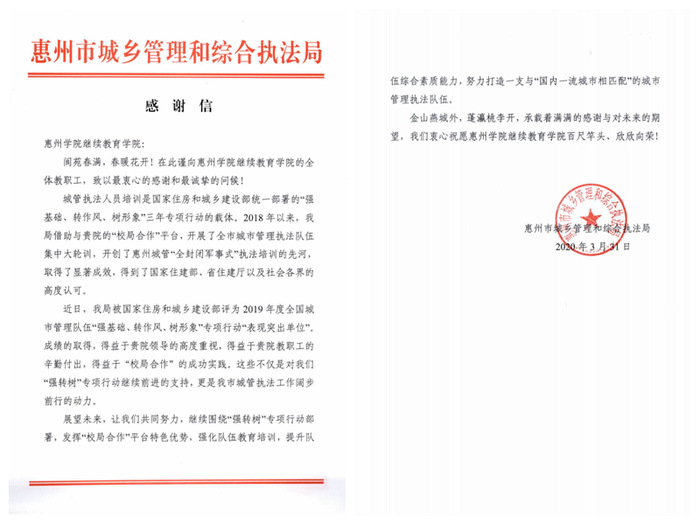 本网讯 近日,惠州市城乡管理和综合执法局给继续教育学院发来感谢信,对该院在服务全市城市管理执法队伍集中大轮训中作出的贡献表示感谢。