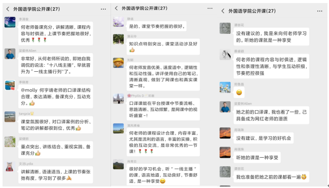 公开课结束后,学校督导组成员和听课老师们对何宇靖老师的课堂给与了高度评价。学院英语系还组织了学院老师进行评课活动。老师们踊跃发言,对何宇靖老师的课堂给予了一致好评,纷纷表示这是一堂优秀的口译课,受益匪浅。
