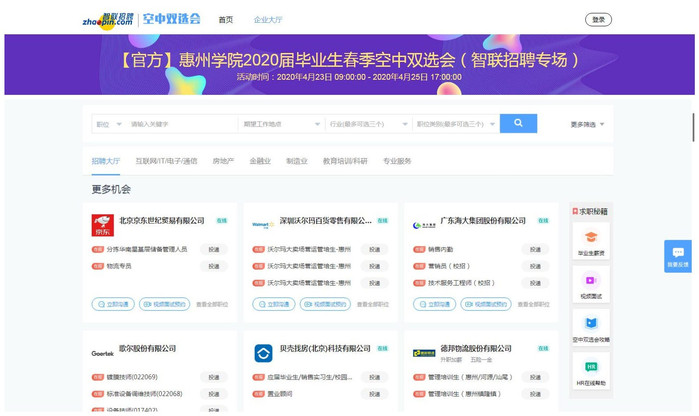 本网讯 受经济下行压力和新冠肺炎疫情叠加影响,2020年毕业生就业工作面临严峻考验。为有效缓解疫情对毕业生就业带来的影响,全力打好2020年“就业攻坚战”,我校学生处主动出击、积极开拓就业市场,于4月23日-25日,联合智联招聘举办了惠州学院第四场2020届毕业生春季空中双选会。