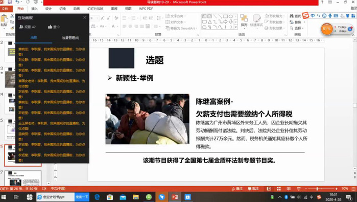课程中,李耿晖老师通过PPT课件、相关内容的视频案例解读、制作方式分解等方式,结合自身工作经验以及鲜活生动的例子分析,与学生的互动中,将评论类专题节目中导演应该具备的基本素质、制作技巧、全流程把控等方面的内容进行了讲述。