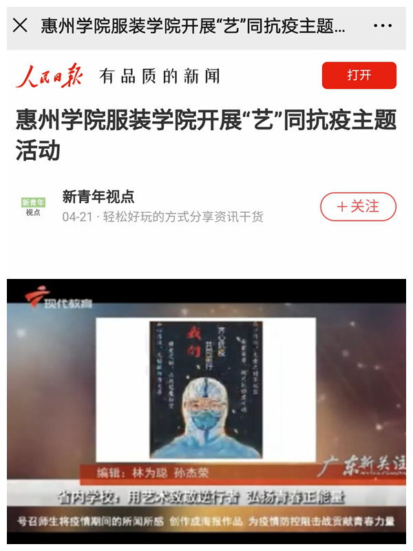 本网讯 近日,人民日报、新华网、触电媒体新闻客户端、广东广播电视台现代教育频道对旭日广东服装学院组织开展的“抗击疫情,我们在行动”专题作品征集活动及优秀作品进行了报道。