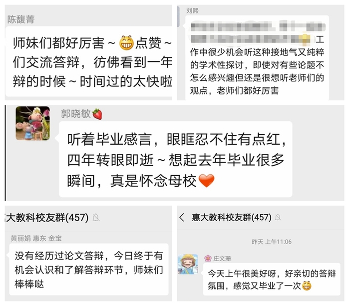 旁听的许多校友反响良好,2017届庄文珊校友留言:“好亲切的答辩氛围,感觉又毕业了一次。”2017届校友刘熙感慨道,在工作中很少有机会听到这种接地气又纯粹的学术性探讨,感谢老师们。
