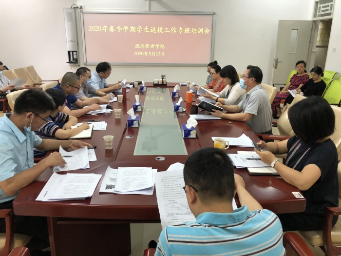 本网讯 5月13日上午,经济管理学院在教学实验大楼1508会议室召开了2020年春季学期学生返校工作专班培训会,学院领导班子、毕业年级班主任、全体辅导员及教务员参加了现场会议,学院其他教师通过钉钉直播平台线上参加会议。