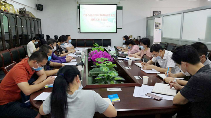 本网讯 5月14日上午,文学与传媒学院在旭日大楼427会议室召开2020年春季学期学生返校工作布置会。学院党政领导、办公室主任、毕业班班主任、辅导员、教务员参加会议。会议由学院党总支书记赖常青主持。
