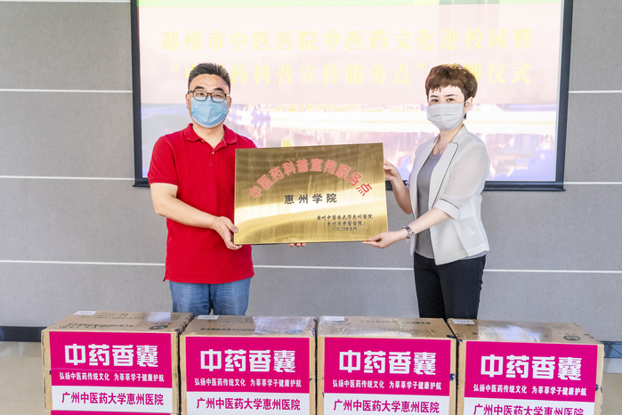 广州中医药大学惠州医院(惠州市中医医院)一行向学校赠送了防疫香囊、益气防感茶、艾条、《惠州市新冠肺炎中医药预防保健指引(第一版)》等一批防疫物资。